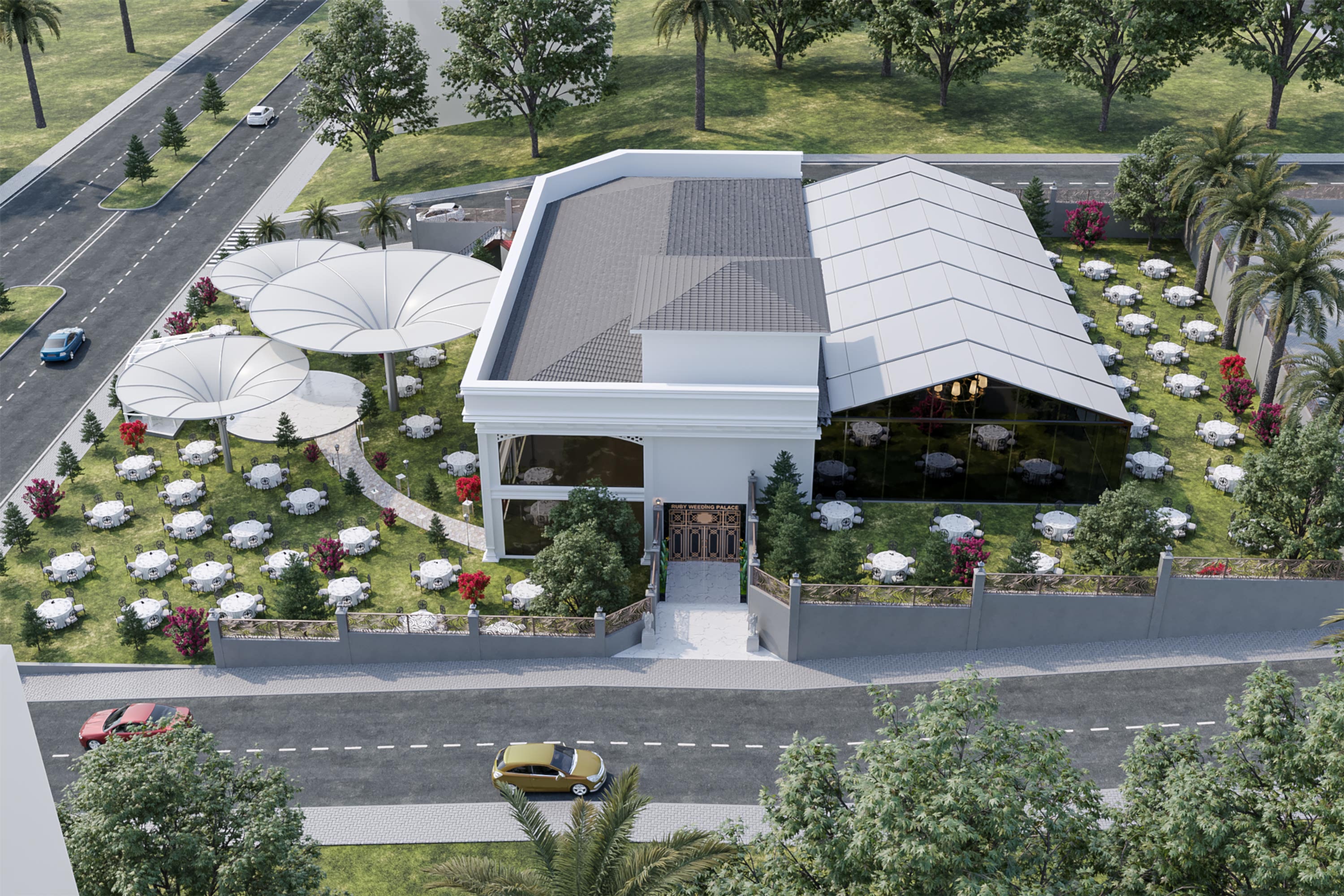 Proje alanımız gölü görmektedir ve eğimli bir alandadır.Eğimin olmasını avantaja çevirerek iki adet ayrı salon tasarladık.Ve bu salonlar aynı afnda iki düğüne ev sahipliği yapabilmektedir.